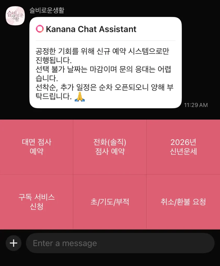 노슬비 신당 예약 바로가기를 찾고 있다면, 김포 무당슬비 위치부터 복채 기준, 전화번호, 카톡 예약 주의사항까지 2026년 기준으로 정확히 확인해야 합니다. 최근 버튼식 카톡 예약 시스템으로 변경되면서 예전처럼 채팅을 여러 번 보내면 오히려 예약 확인이 늦어질 수 있습니다. 이 글에서는 위치, 복채 10만원 기준 상담 비용, 전화번호 예약 방법, 카톡 예약 시 반드시 지켜야 할 주의사항까지 핵심만 정리해드립니다.